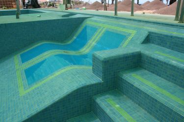 la piscina principal del hotel se reformó completamente, se impermeabilizó y se diseñó con un nuevo mosaico cerámico en tonos verdes.
